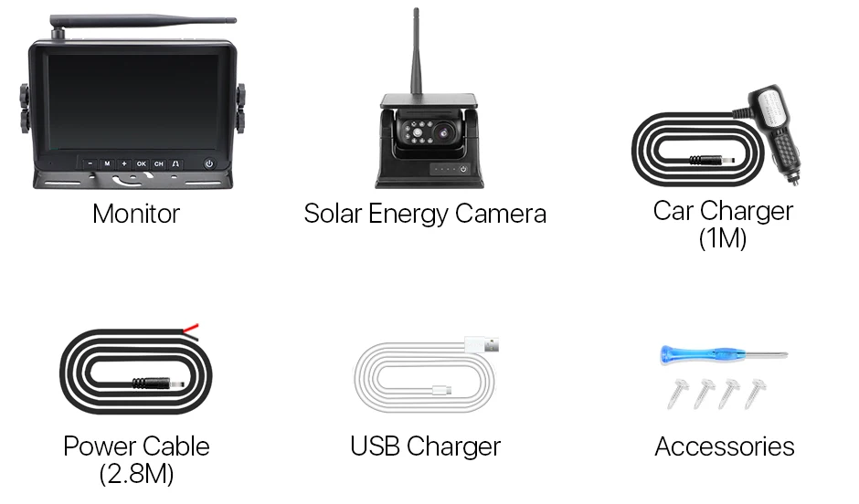 Monitor *1 ; Cameras *1; Car Charger *1; Power Cable *1; USB Charger; Accessories