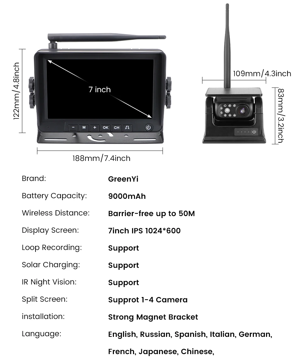 • Powered By the Sun, 9000mAh larger battery capacity, both the monitor and the camera will show the battery status; If solar panel receives 30 mins daily exposure to the sunlight, only charge it once a year. Even in the rainy season, it can last for 3 months of average use (2~3 times per day). Besides, you could charge it via power outlet(micro usb input port).