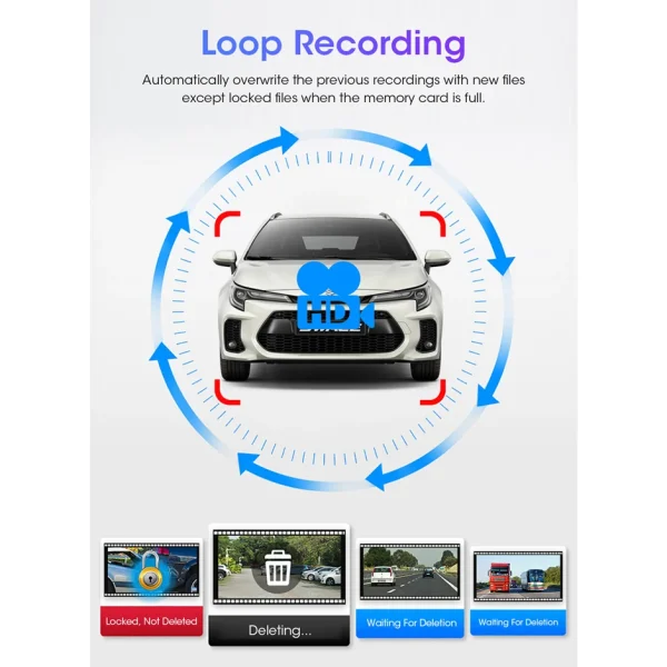 • Loop Recording: New recordings automatically overwrite older footage when the memory card reaches full capacity.